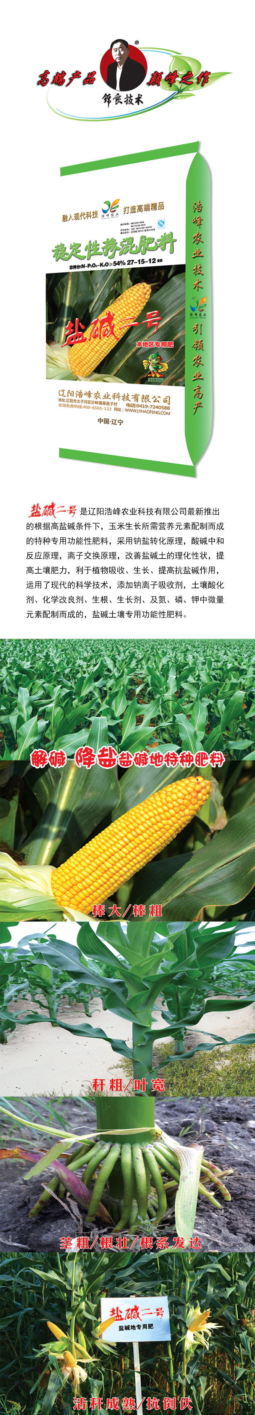 鹽堿二號是遼陽浩峰農(nóng)業(yè)科技有限公司最新推出的根據(jù)高鹽堿條件下,玉米生長所需營養(yǎng)元素配制而成的特種專用功能性肥料,采用鈉鹽轉(zhuǎn)化原理,酸堿中和反應(yīng)原理,離子交換原理,改善鹽堿土的理化性狀,提高土壤肥力,利于植物吸收、生長、提高抗鹽堿作用,運用了現(xiàn)代的科際酰砑幽評胱游占?,土壤藥F?、化学改良剂、生根、生长剂、及氮、磷、钾中微量元素配重汎成的,盐煎{寥雷ㄓ霉δ芐苑柿稀?