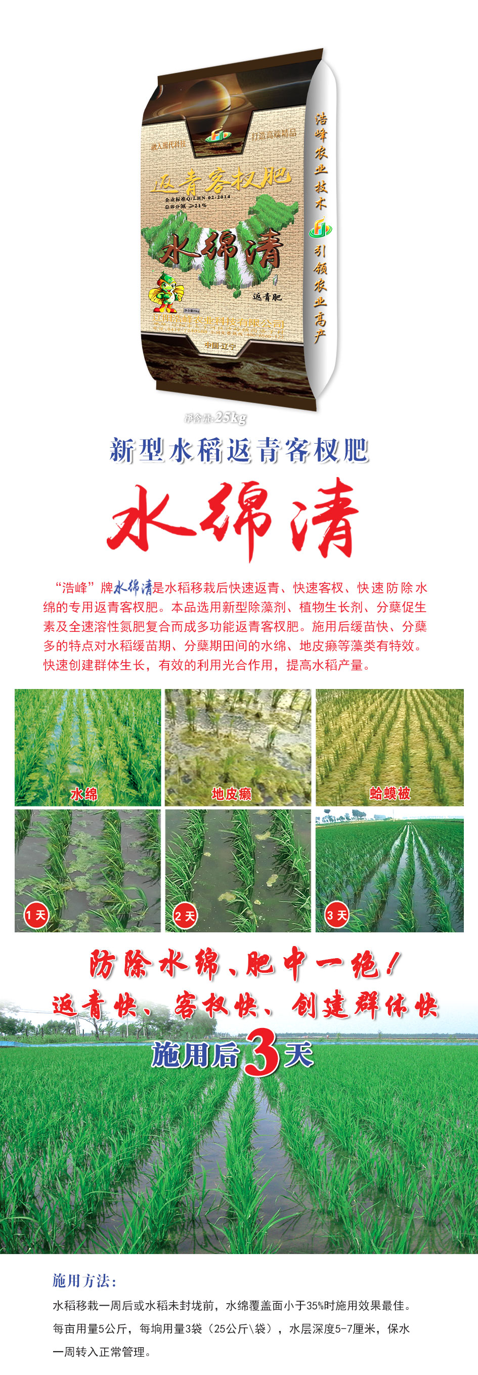 “浩峰”牌 是水稻移栽后快速返青、快速客杈、快速防除水綿的專用返青客杈肥。本品選用新型除藻劑、植物生長(zhǎng)劑、分蘗促生素及全速溶性氮肥復(fù)合而成多功能返青客杈肥。施用后緩苗快、分蘗多的特點(diǎn)對(duì)水稻緩苗期、分蘗期田間的水綿、地皮癩等藻類有特效??焖賱?chuàng)建群體生長(zhǎng),有效的利用光合作用,提高水稻產(chǎn)量。